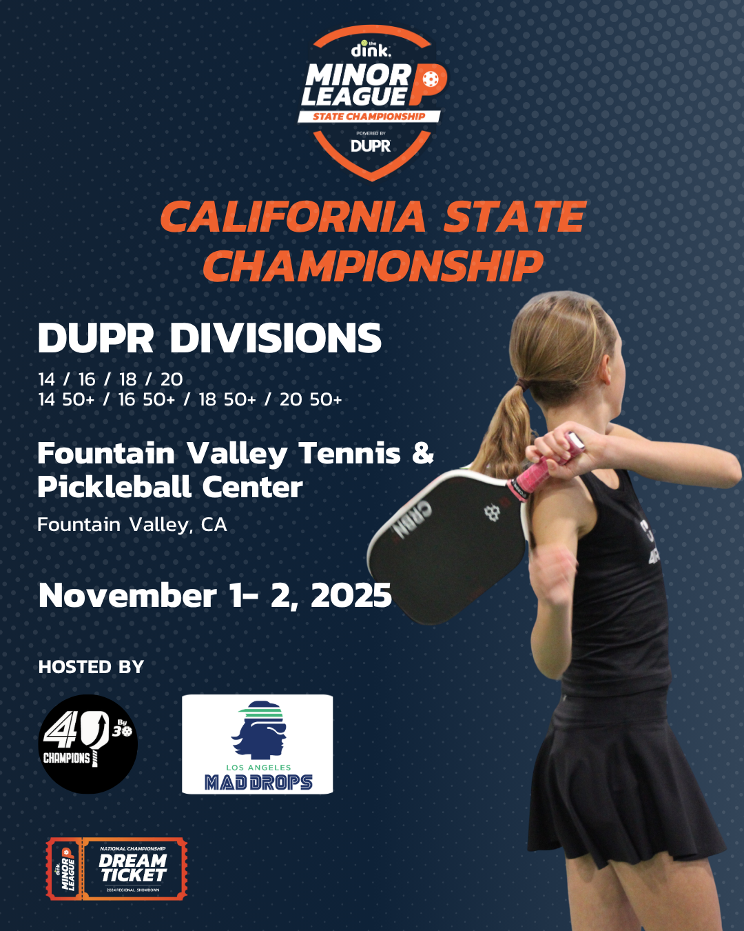 California State Championship (Nov 1–2) at Fountain Valley Tennis & Pickleball Center. This event is sponsored by the LA Mad Drops and will also include a watch party for the MLP Cup.
