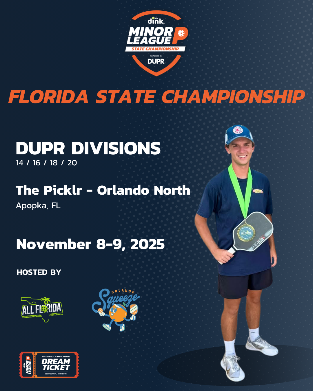 Florida State Championship (Nov 8–9) in The Picklr Orlando, hosted by All Florida Pickleball and the Orlando Squeeze.
