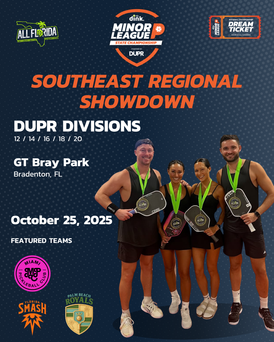 Southeast Regional Showdown (Oct 25) at GT Bray Park in Bradenton, Florida, featuring activations from Florida Smash, Miami Pickleball Club, and Palm Beach Royals.