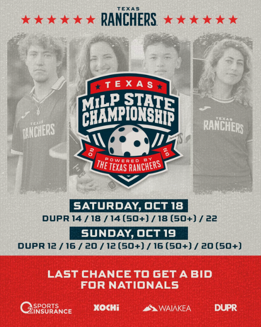 Texas State Championship (Oct 18–19) at The Picklr in Austin West, hosted by the Texas Ranchers. All registered players will receive an exclusive Ranchers swag bag.